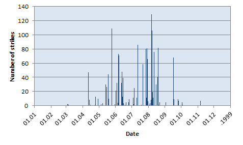 In this region, thunderstorms are clearly a seasonal phenomenon with peak activity in summer (say May to September) and almost no activity in winter (November to March), as one can see in the following chart summarizing the total number of strikes per day in 1999.
