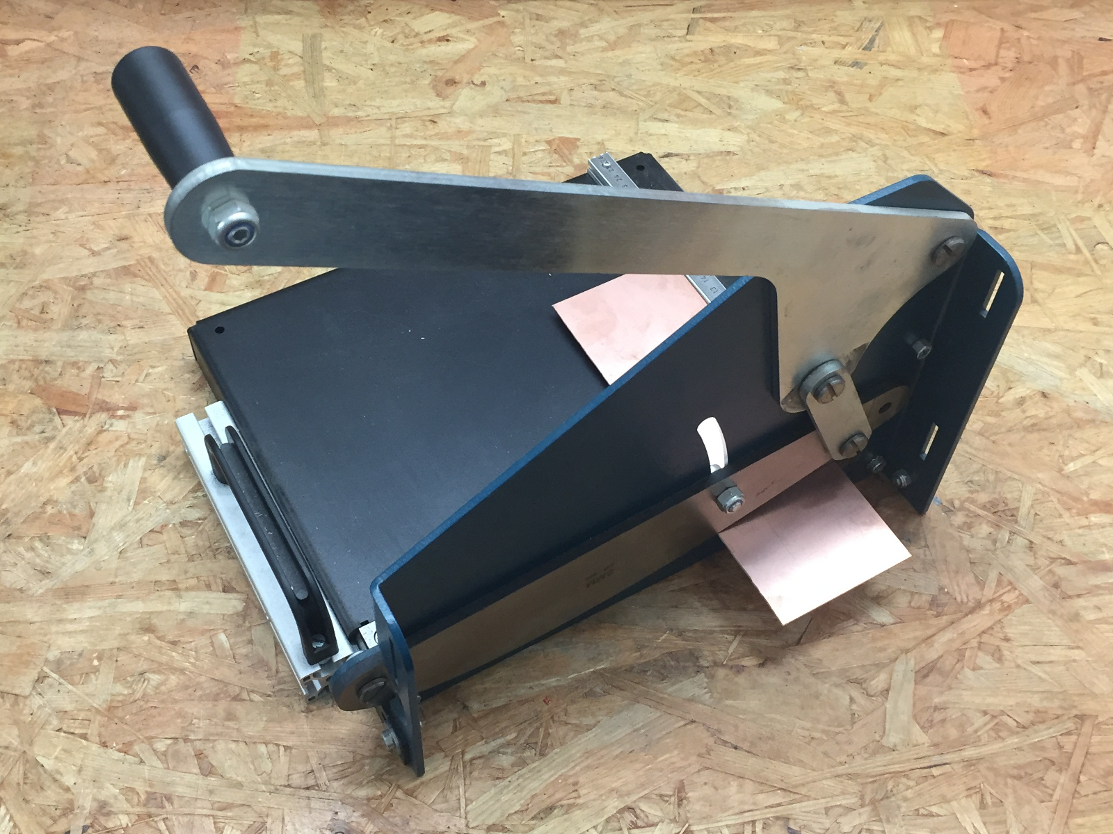 I modified my laminating machine by replacing the thermal switches to increase its temperature. Still, it's still a bit on the cold side and I need a flatiron anyway. To prevent it from overheating, I cut off the top part of the cover. This also allows better handling of the PCB.
