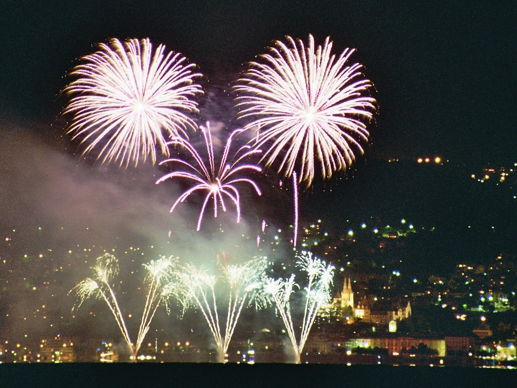 The following pictures were taken on August 1st, 2005. The city in the background is Neuchâtel (Switzerland) and was about 6 km away from my location, just across the lake. The lake is visible as a black area at the very bottom of some images.